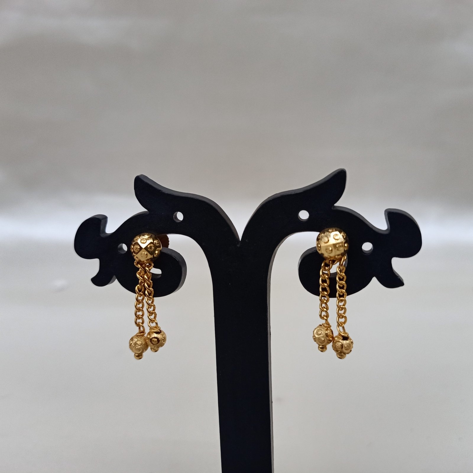 A delicate , gold plated stud earing with intricate detailing . Lightweighted and elegant .
