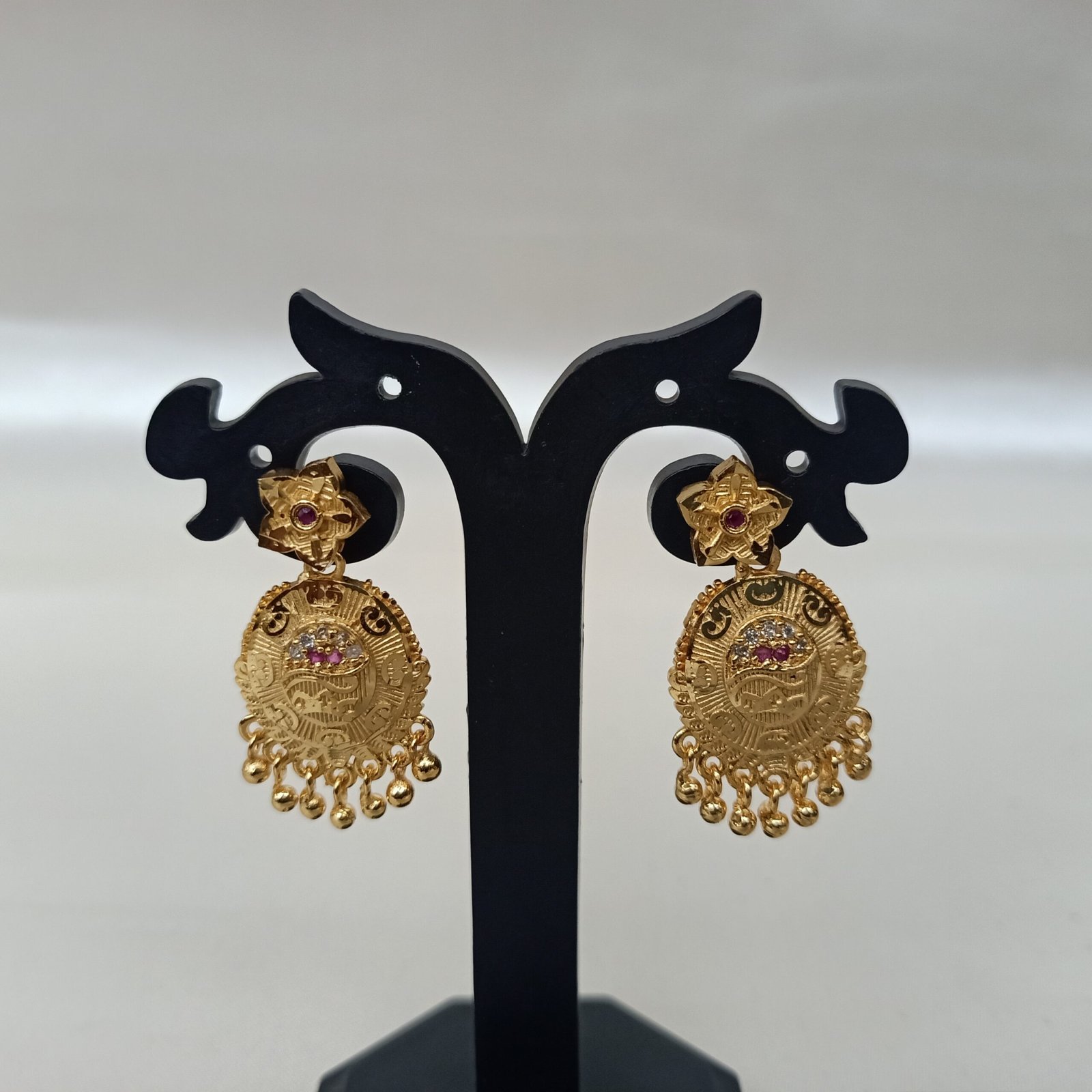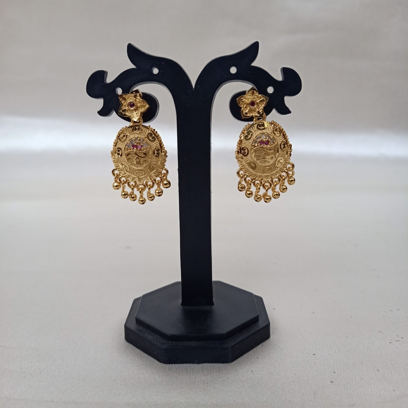 A delicate , gold plated earing with intricate detailing . Light weighted and elegant .