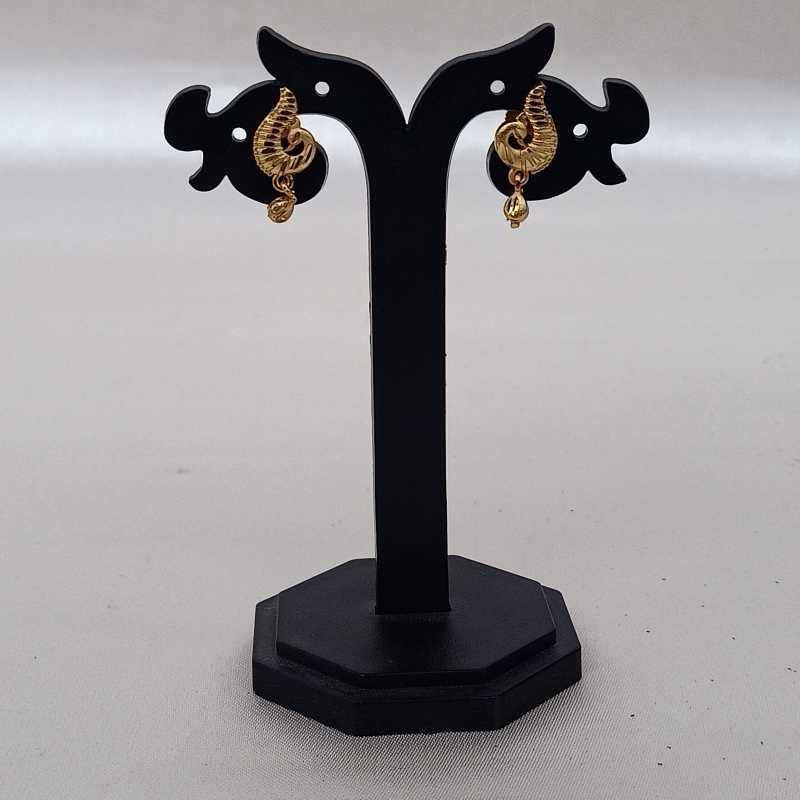 A delicate , gold plated stud earing with intricate detailing . Light weighted and elegant .