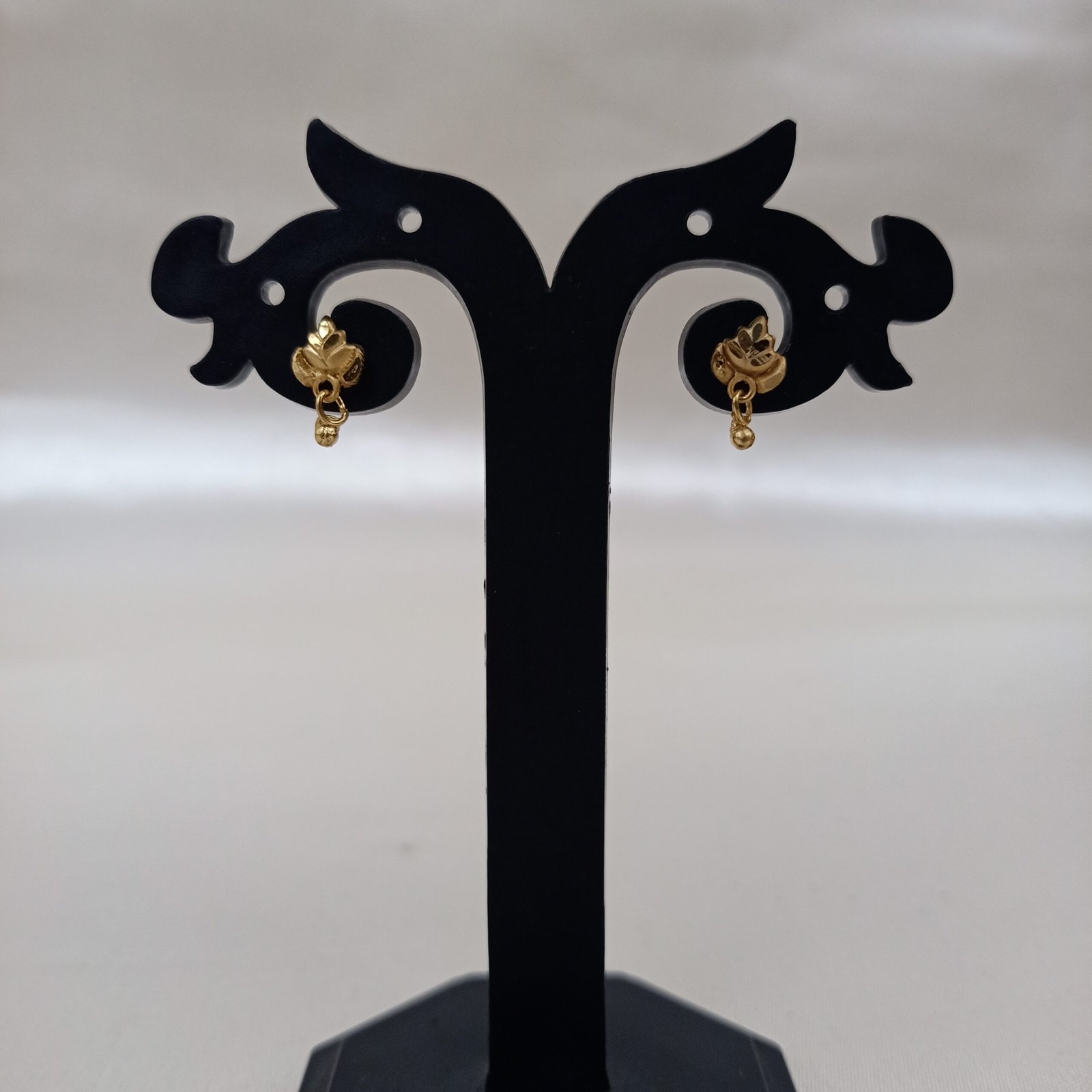 A delicate , gold plated stud earing with intricate detailing . Lightweighted and elegant .
